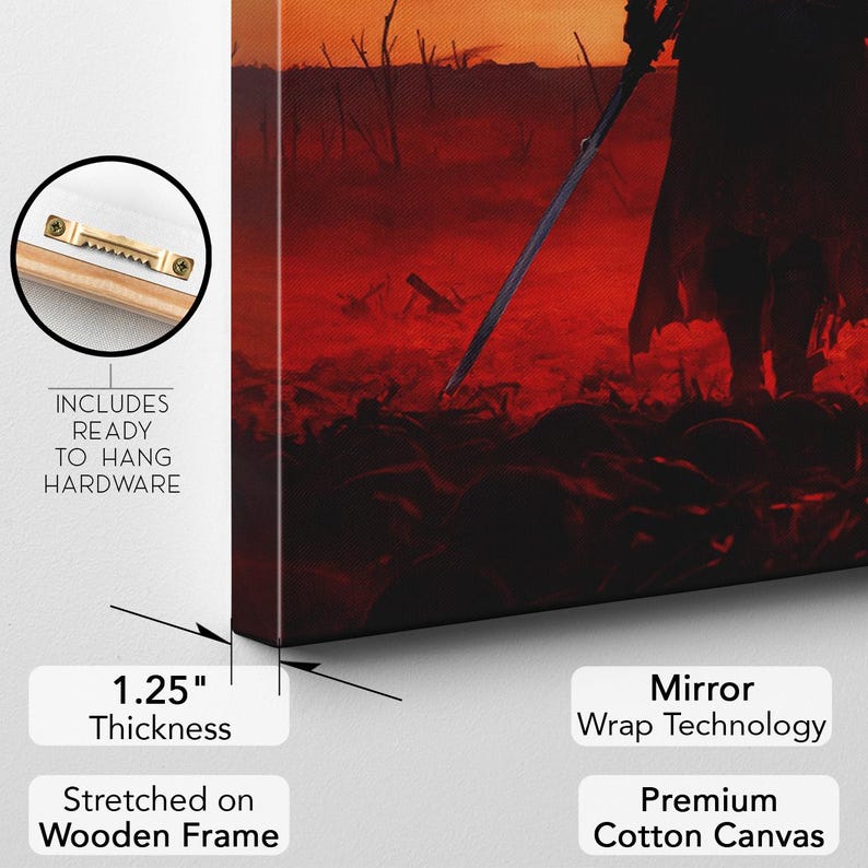 Dark Fantasy Warrior Canvas Print | Red Moon Epic Wall Art | Hooded Figure on Battlefield | Gothic Home Decor Gift for Him