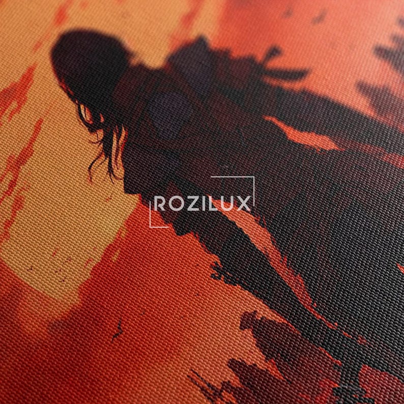Epic Fantasy Warrior Canvas Print, Red Rose Field Wall Art, Dramatic Sunset Home Decor Gift