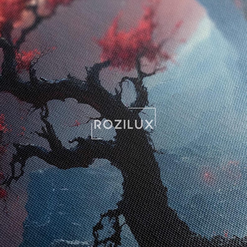 Fantasy Landscape Canvas Print, Cherry Blossom Tree Wall Art, Red Moon Mountain Lake Art, Dramatic Home Decor