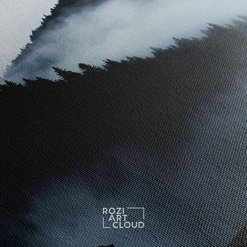 Misty mountain forest bear wall art canvas print, animal nature scene in black and white, modern decor for living room & office