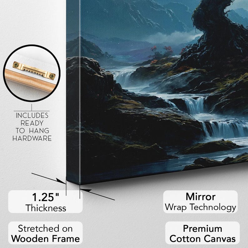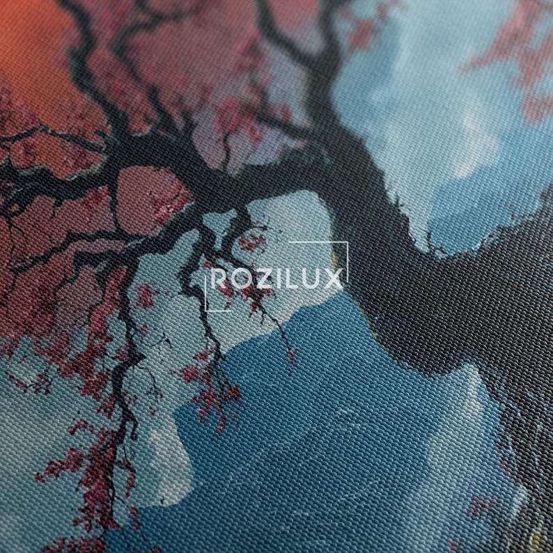 Mystical Cherry Blossom Blood Moon Canvas Print, Japanese Landscape Mountain Wall Art, Nature River Decor