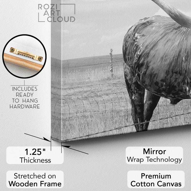 Texas cattle prints for bedroom, animal canvas art, modern home decor, black and white hanging, oversized wall art