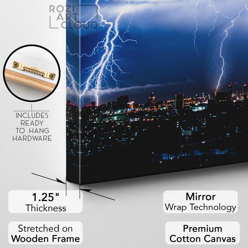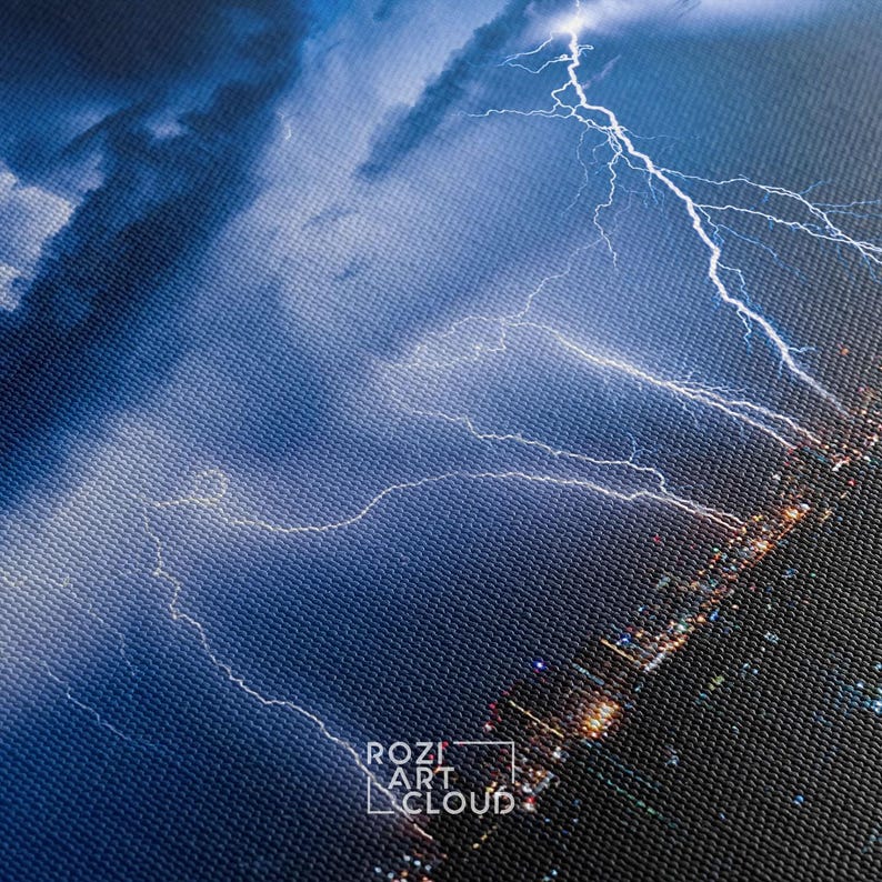 Thunder canvas print, city wall art, night city poster print, cityscape decor, clouds artwork